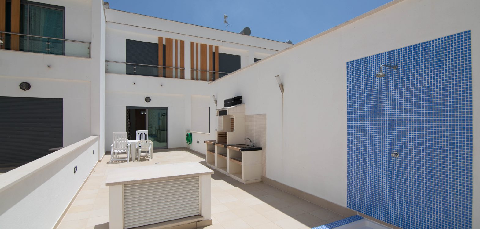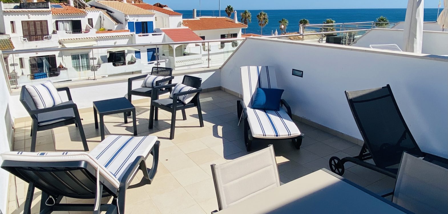 On the upper floor is the second bedroom with a double bed, a small bathroom with shower, a kitchenette/dining area plus a comfortable lounge area which leads onto a private terrace. This front terrace is furnished with sun-loungers, chairs and dining table – it overlooks the sea-front esplanade and has sea view.